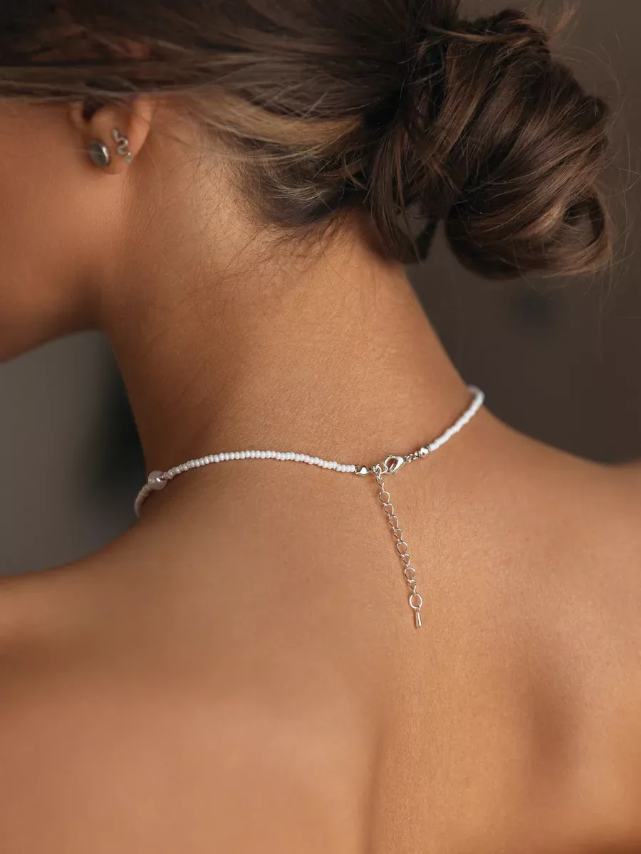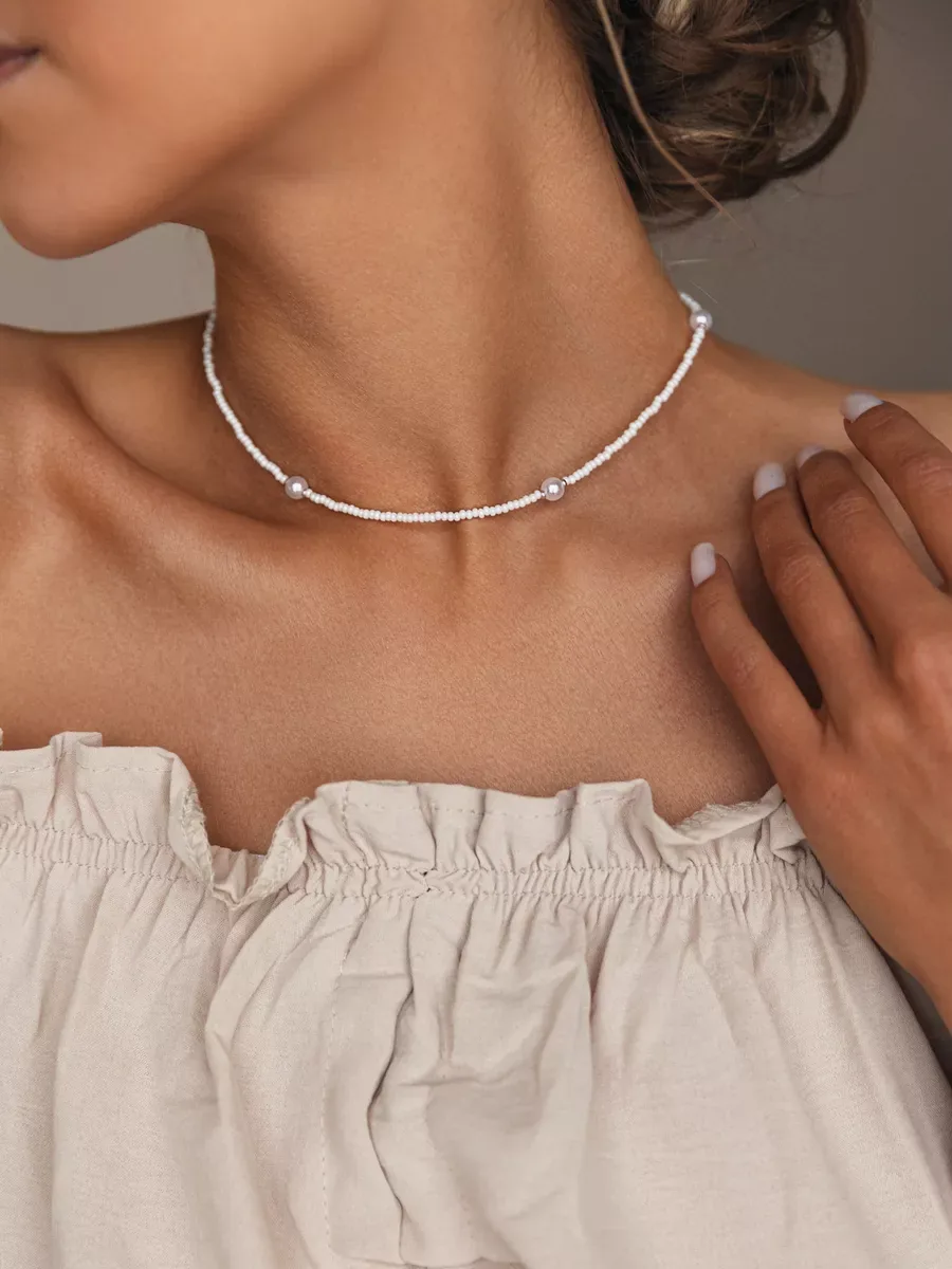 A delicate beaded choker combining artisan craftsmanship with feminine elegance. Handcrafted in Russia using premium Czech beads and a jewelry cable foundation, this neck choker sits beautifully at the collarbone with an adjustable 36 cm length plus 5 cm extension chain. The white acrylic bead inserts create a soft, romantic look perfect for both everyday wear and special occasions. Complete with a secure carabiner clasp and arrives in gift-ready packaging.