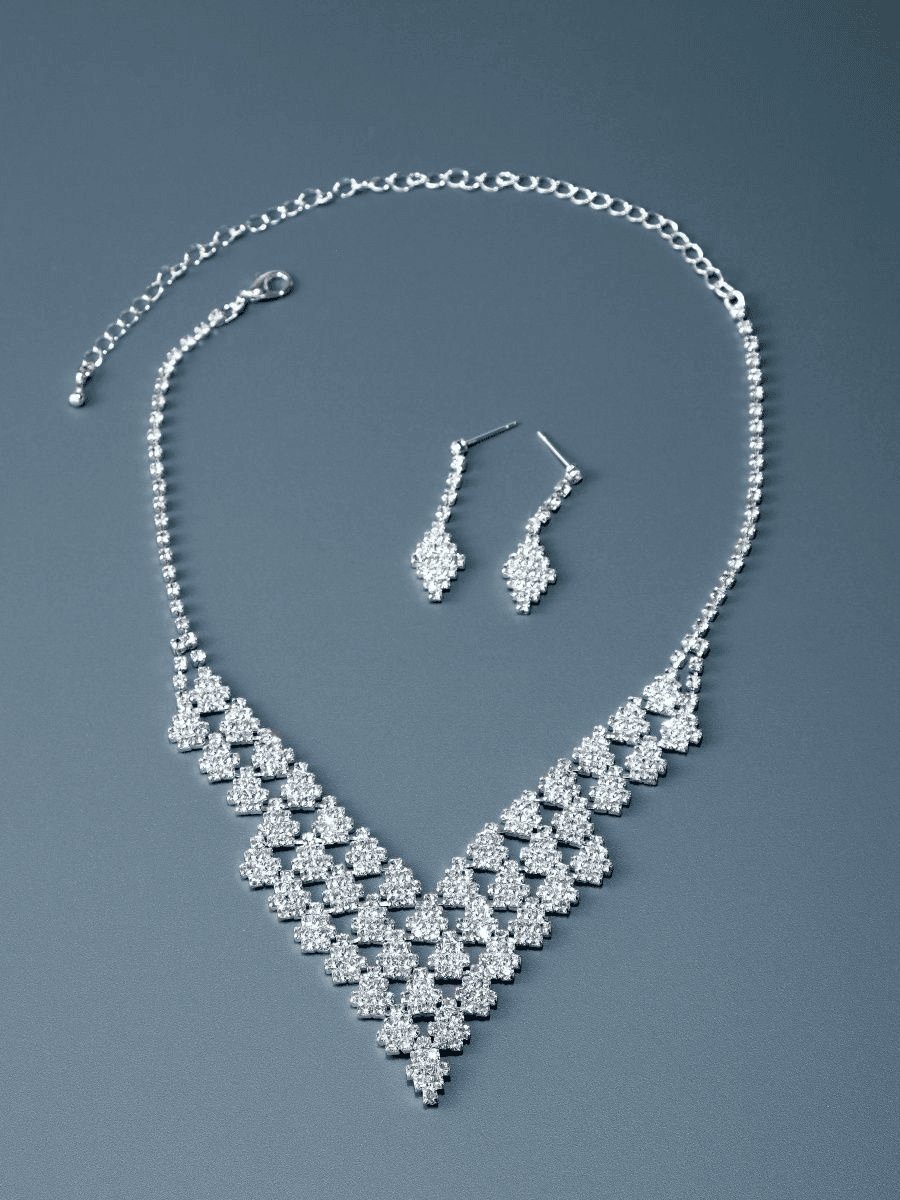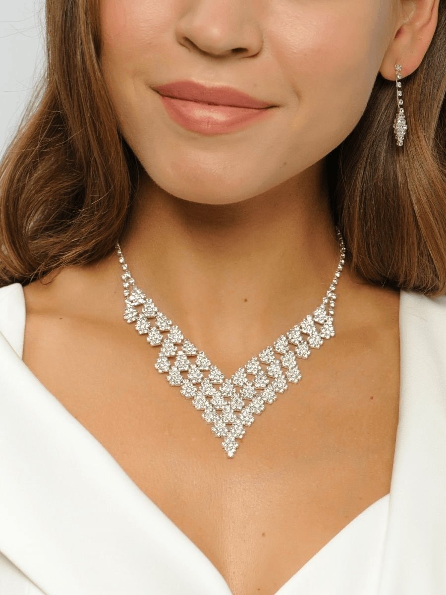 Dazzle at any event with this Radiant Diamond-Cut Crystal Necklace and Earrings Set, a perfect blend of elegance and sophistication. Crafted with sparkling crystal details and a timeless V-shaped design, this set adds a touch of luxury to any outfit.